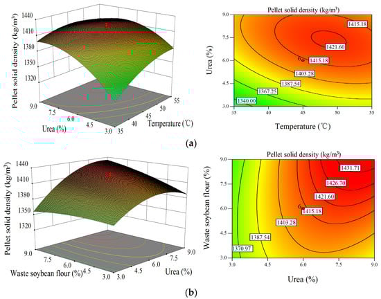 Response surface plots of pellet solid density between variables: (a) urea and temperature; (b) WSF and urea.