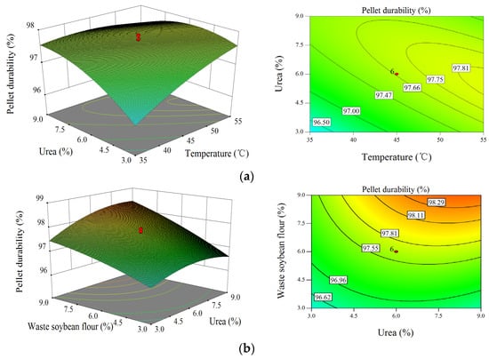 Response surface plots of pellet durability between variables: (a) urea and temperature; (b) WSF and urea.