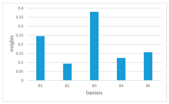 The lack of skilled workers scored the second highest weight of 0.2456. The high rank of this barrier indicates that the bearing manufacturing companies will face this serious hurdle during the adaptation of the latest Industry 4.0 key technologies in practices. This barrier is followed by a lack of technical infrastructure (B5), which was weighted 0.156. It is a fundamental, central, and critical barrier to the implementation of Industry 4.0, necessitating urgent attention during the development of the Industry 4.0 approach. The least weighted barriers were a lack of standard planning and strategy (B4) and a lack of managerial competency (B2), with weights of 0.1248 and 0.0938, respectively, where these barriers obtained the least pressing and important priority ranking among the barriers.