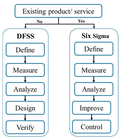 Most of these approaches have a great base in the six sigma principles, such as DMAIC (define, measure, analyze, improve, and control), used for continuous quality performance improvement [39]. Design for six sigma (DFSS), which also applies the six sigma principles, is a systematic, disciplined method of problem prevention that is frequently utilized to create innovative, reliable engineering systems [9]. The most frequent DFSS approaches and their phases, as shown in the literature, are summarized in Table 8 [40].