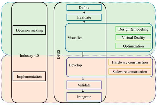 - To fill the gap of high investment cost and provide the knowledge and information required to make technical decisions toward Industry 4.0, we divided the development process into two steps: the decision-making step and the implementation step. The decision-making step is based on design, modeling, and virtual simulation technologies and the implementation step is based on the required key technologies for Industry 4.0 adaptation in accordance with the desired development design.