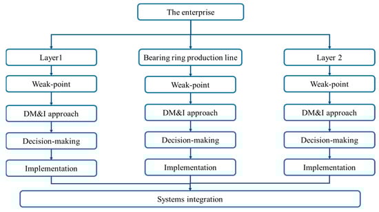 Due to the implementation barriers, high requirements, and risks, it is difficult for most organizations to get involved with the Industry 4.0 transition. Several studies, for instance, have examined the implementation of Industry 4.0 technologies on an individual basis; Industry 4.0 was discussed by Vogel-Heuser and Hess using the German term, which is also known as CPS and Cyber-Physical Production System (CPPS) in manufacturing systems [32]. The area of supply–demand matching manufacturing services in cloud computing concept was addressed by Tao et al. [33]. The scenarios of design principles for modeling and simulation in Industry 4.0 were proposed by de Paula Ferreira et al. [34]. Waibel et al., however, looked into the impact of intelligent production systems in Industry 4.0 [35]. However, instead of individually implementing Industry 4.0 technologies to reduce the risk, in this study we assumed that, in the proposed Industry 4.0 approach, the departments of the intended organization will be subdivided into multiple small layers, with each layer having its own improvement objectives, which will then serve as the system’s weak points in each layer. The scheme of the proposed approach’s layer divisions is depicted in Figure 2 as a guide for individual layer improvement with system integration capability.