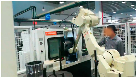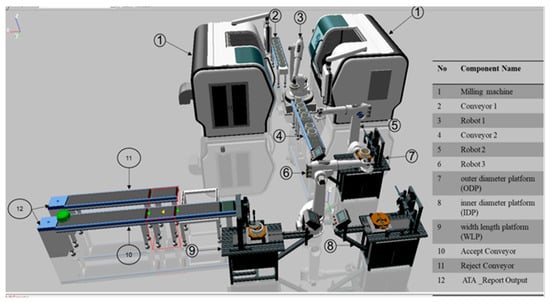 As illustrated in Figure 8, the intended production line produces a railway-bearing ring. The particular production line consists of two CNC milling machines, and one handling robot operates both of the machines automatically. However, all other operations, including quality inspection, were carried out manually, which reduced productivity and bearing quality. The first step in getting the company on track toward an Industry 4.0 transition is by automating all manufacturing operations. Thus, from the weak point introduced by the company, the ideal goal is to improve product quality and enhance the company’s productivity via building an intelligent automatic bearing dimensional quality measurement system.