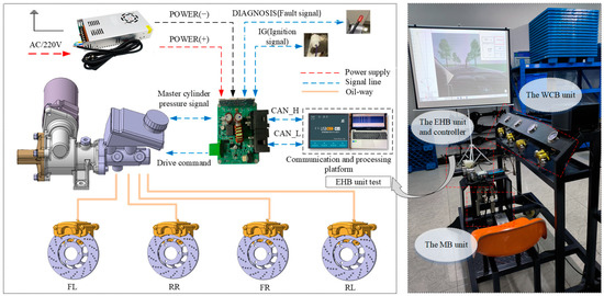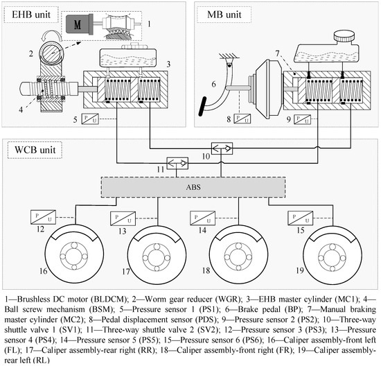 Figure 1 shows the schematic of the human–machine redundant braking system (HMRBS) proposed in this paper. The system mainly comprises the MB unit, the EHB unit, and the wheel cylinder braking (WCB) unit. The EHB unit is connected in parallel to the original vehicle braking system (i.e., MB unit) through two three-way shuttle valves. The MB unit is consistent with the original vehicle system without any changes. It has the advantage of having a simple structure, high reliability, low cost, easy modification, and low debugging, especially for vehicles in the aftermarket. Therefore, the HMRBS has two braking modes: active braking mode and manual braking mode. The HMRBS works as follows: