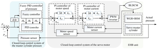 A closed-loop control strategy of the EHB unit is proposed in this paper, including the master cylinder pressure controller with adaptive fuzzy PID and the servo motor speed controller with double-closed-loop PI, shown in Figure 2. kp, ki, and kd are PID control parameters. Δkp, Δki, and Δkd are the variations of the PID control parameters. Ptar is target pressure, Pact actual pressure, utar target voltage, uact actual voltage, itar target current, and iact actual current.