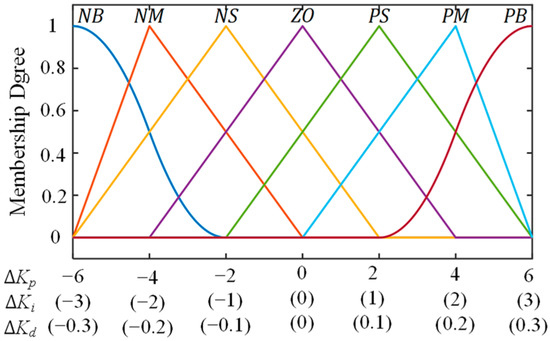 The output of the adaptive fuzzy PID controller consists of three correction terms, ∆kp, ∆ki, and ∆kd, which modify the PID control parameters kp, ki, and kd, respectively. The domains and fuzzy subsets for these output terms are defined as follows: the domain of ∆kp is {−6, −4, −2, 0, 2, 4, 6}, the domain of ∆ki is {−3, −2, −1, 0, 1, 2, 3}, and the domain of ∆kd is {−0.6, −0.4, −0.2, 0, 0.2, 0.4, 0.6}. Correspondingly, the fuzzy sets are {NB, NM, NS, ZO, PS, PM, PB}, with a quantification factor of 1 for each term. The membership function type of the input and output variable is mainly triangular, and the membership function is obtained after fuzzification, as shown in Figure 4.