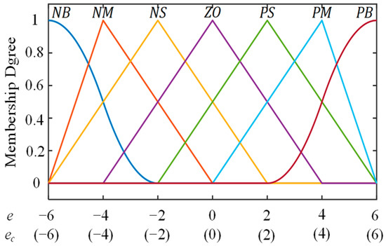 The variables are scaled into the integer discourse domain range of [−6, 6], and both concrete subsets of numbers are {−6, −4, −2, 0, 2, 4, 6}. The fuzzy set corresponding to the basic domain is set to {NB NM NS ZO PS PM PB}. The discourse domain of input variables is divided into seven membership functions: NB (Negative Big), NM (Negative Middle), NS (Negative Small), ZO (Zero), PS (Positive Small), PM (Positive Middle), and PB (Positive Big). Fuzzification of the theoretical domains of e and ec yields a mainly triangular affiliation function, as shown in Figure 3.