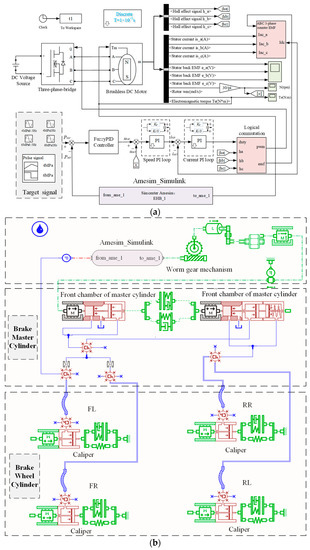 The co-simulation model of the EHB unit of HMRBS: (a) the controller sub-model in Matlab/Simulink; and (b) hydraulic mechanism sub-model in AMESim.