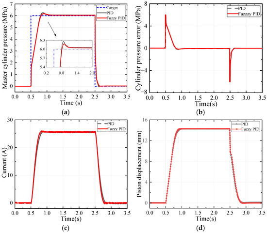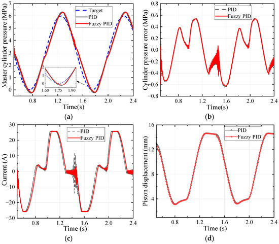 Figure 6 shows the results of the case with the step signal. The simulation case can evaluate the transient response of rapid pressurisation, rapid decompression, and pressure-holding capacity of the master hydraulic pressure under emergency active braking conditions. The rise time of PID and fuzzy PID is almost the same. The overshoot of PID is 0.26 MPa, and the steady-state error is 0.05 MPa. The overshoot of the fuzzy PID proposed is 0.18 MPa, and the steady-state error is 0.04 MPa, which are reduced by 42% and 20%, respectively.