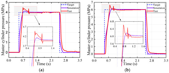 Figure 9 shows the time–pressure history results of the step target pressure-tracking test. The pressure value of the master cylinder can coincide well with the target signal with 4 MPa and 6 MPa, respectively. The actual pressure overshoot of the test is kept within 0.6 MPa, and the steady-state error is kept within 0.3 MPa, which meets the basic requirements of the HMRSB for braking efficiency.