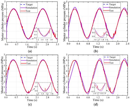 The test results of the sine target pressure tracking are provided in Figure 10. Different signal offsets (2 MPa and 3 MPa), amplitude (2 MPa and 3 MPa), and frequency (0.5 Hz and 1 Hz) were set in the test. The results show that the pressure of the master cylinder has high accuracy in tracking the periodic dynamic target pressure. The maximum tracking error between the actual and target values is within 0.7 MPa, which appears in Figure 10d. However, there are also shortcomings, such as fluctuations of the pressure signal intermittently, which are proportional to the target pressure amplitude and frequency. The fluctuations in all the tests are mainly due to the uncertain frictional characteristics of the actual transmission components, which are not considered in the simulation model.