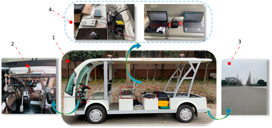 A test LSEV equipped with HMRBS. 1—Sightseeing vehicle; 2—HMRBS; 3—Test road; 4—High precision GPS/IMU system and CAN data analyser.