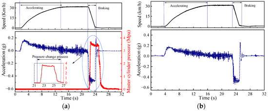 Considering that the test vehicle is used in a closed scenario, the maximum braking pressure of the master cylinder is limited to 4 MPa, and it can meet the vehicle braking demand. During the test, the vehicle was accelerated to 30 km/h and then held at a constant speed for a while before the brakes were applied. Emergency and mild brakes with active and manual braking modes were applied to evaluate the braking performance in different conditions.