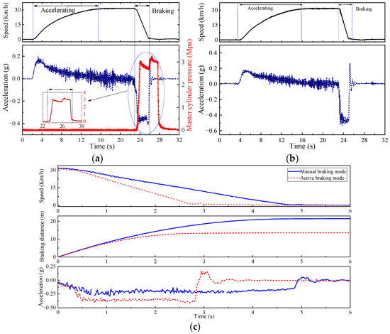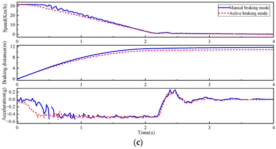 Emergency braking test: (a) active braking mode; (b) manual braking mode; and (c) comparison of vehicle dynamics characteristics.