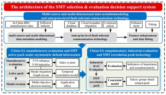 Manufacturers’ smart evaluation and SMT active push technology under asymmetric default information. In view of the existing problems, such as the lack of an intelligent evaluation of manufacturers and the delayed push of SMT in SA, research on intelligent evaluation of manufacturers was firstly conducted. Then, using deep learning techniques, the active push technology for SMT was constructed to establish an orderly correlation between the manufacturers’ demand, technical competence, and spatio-temporal sequence. The regularity of SMT introduced in different stages among Chinese manufacturers was revealed. Through cross-industry and transnational transfer learning, the active push technology in China was transformed into that in SA. Finally, the multi-objective decision-making and model revision technology for SMT application were studied, and the effectiveness model and feedback mechanism of SMT application in manufacturers were explored, as shown in Figure 3.