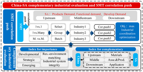China–SA, complementary, industrial-level evaluation and advanced technology correlation push technology. Firstly, the evaluation technology for assessing the critical importance and complementarity at the industrial level in China and SA was studied, with special evaluation indexes being determined, including developmental, strategic, emerging, and resource–environment matching. Secondly, the correlation push technology for SMT at the industrial level was investigated. Constrained by the demand of downstream products and the functional and development demands, it promotes the combination of industries that are strong and the complementarity of advantages and disadvantages. Finally, the knowledge transfer of SMT and the complementary development of industries between China and SA were achieved, as shown in Figure 4.