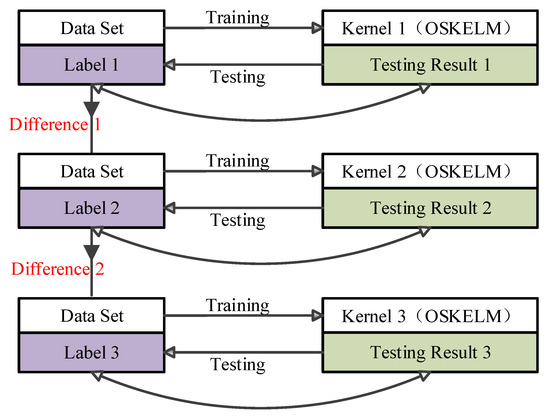 Based on the boosting idea, this study integrated multiple ELMs with different kernels, and the Boosting-OSKELM (boosting online sequential kernelized extreme learning machine) method was introduced, as shown in Figure 5. Firstly, a kernel OSKELM was used for learning and training. Secondly, the difference 1 between the labels and the results 1 can be calculated, which act as new labels in the next round of training. Then, another kernel OSKELM with the difference 2 (between the new labels and the results 2) can be trained again. Generally speaking, after 3 rounds of training with 3 kernel functions (different or the same), an evaluation with a good performance can be obtained.