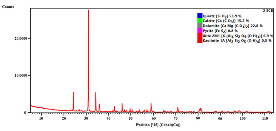 The Longmaxi Formation shale samples were collected from the southwest region of China for the purpose of this study. X-ray diffraction (XRD) and X-ray fluorescence (XRF) are common analytical techniques used to determine the mineral composition and elemental content of geological samples, including shale samples. Based on the XRD pattern shown in Figure 1, the main constituents identified in the shale samples from the Longmaxi Formation were quartz, calcite, dolomite, and illite. These mineral phases are commonly found in shale formations. The presence of quartz, a hard and brittle mineral, suggests that the shale samples have a relatively higher brittleness compared to average shale compositions.