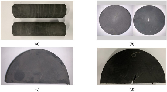 The sample preparation process. (a) Outcrop core pillars. (b) Standard shale disk. (c) Semi-circular specimen. (d) Sample with crack.