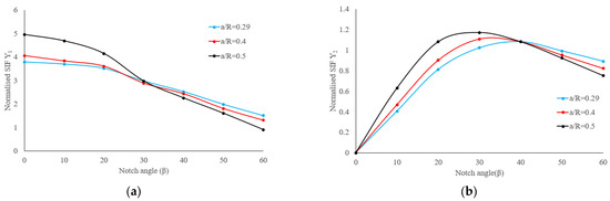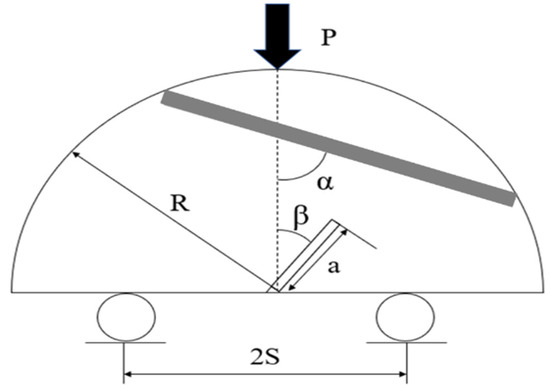 where P represents the load applied on the sample at the point of failure, and B represents the thickness of the sample. The stress intensity factors, KI and KII, represent the magnitudes of stress near the crack tip that control crack propagation. Y1 and Y2 are dimensionless parameters that represent the normalized stress intensity factors in the SCB test. They (Y1 and Y2) are dependent on the specimen geometry parameters, specifically a/R (notch length to radius ratio), S/R (support span to radius ratio), and β (notch angle). These values can be calculated using numerical procedures [30].