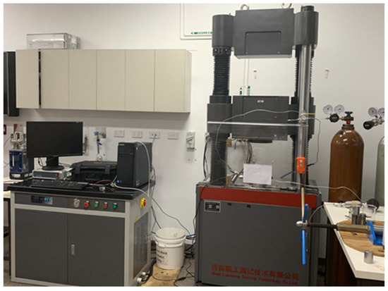 As per the research conducted by Lim et al. [35], it is advantageous to have shorter crack lengths in the semi-circular bend (SCB) specimen for fracture testing. This is attributed to the fact that a shorter crack length helps achieve a lower sensitivity of the stress intensity factor to variations in specimen geometry [32]. Consequently, for the SCB tests, an a/R value of 0.29 and an S/R value of 0.66 were selected. The WAW-1500B servo-controlled rock mechanics test system, depicted in Figure 4, was utilized to perform the SCB tests.