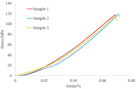 In the uniaxial compression test, the WAW-1500B electrohydraulic servo rock mechanics test system was utilized for the testing of the shale specimens, and the loading rate is set at 0.18 mm/min. During the uniaxial compression test on shale samples, the stress and displacement are recorded to determine the uniaxial compression strength of the samples. The polishing process is carefully controlled to maintain an error within a range of 0.02 mm. The stress–strain curve is shown in Figure 5. The average UCS value of the shale samples is determined to be 112.5 MPa, and the Young’s modulus is measured to be 28.6 GPa. The experiment results are used in the following numerical simulations in this paper.