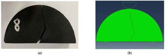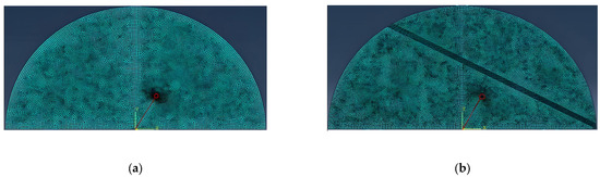 Setting up a semi-circular bend (SCB) 2D model involves defining the geometry, material properties, boundary conditions, and loading conditions based on the specifications of the testing specimens. In this section, the basic parameters of the model were investigated. Based on the geometry model, the calculation of Y1 and Y2 can be determined [36]. Indeed, when the SCB specimen contains bedding layers or vein fractures, the presence of these features can affect the values of Y1 and Y2. In this study, a numerical model is established for computing Y1 and Y2 for specimens containing bedding layers or fractures. The SCB specimen’s typical model with bedding layers or fractures in an ABAQUS setup is depicted in Figure 6. Quadratic elements were employed to mesh the crack tip region in the numerical model. Quadratic elements have a higher order of interpolation compared to linear elements, allowing for a more accurate representation of the stress and strain fields near the crack tip. Quadratic elements utilize more nodes and shape functions, enabling them to better approximate complex stress and strain distributions. Near the crack tip, stress and strain fields often exhibit significant gradients, which linear elements may not fully capture due to their limited interpolation capabilities.