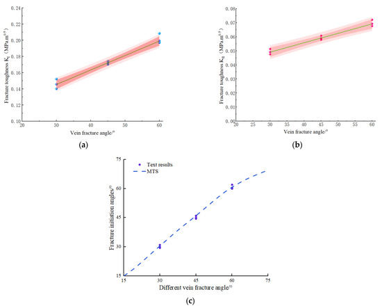 Experiment results of mixed mode at different vein fracture angle. (a) KI at different vein fracture angle. (b) KII at different vein fracture angle. (c) Experimental values and MTS criteria for initial crack propagation angle at different vein fracture angle.