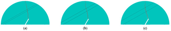 The influence of different vein fracture thicknesses on fracture propagation was explored through the data obtained from the above simulation verification. Figure 12 shows the fracture paths of samples with different vein fracture thicknesses. The vein fracture paths running through the entire sample are shown in Figure 12a. The small thickness of the vein fracture has almost no effect on the fracture propagation, and the fracture directly passes through the small thickness of the vein fracture. In Figure 12b, the normal fracture passes through the vein fracture, but an obvious path zigzag occurs before passing through the vein fracture, and an obvious turn occurs after passing through the vein fracture. In Figure 12c, the thickness of the vein fracture further increases, and the propagation path is similar to Figure 12b, but there is a certain deviation. The thickness between the three types of vein fracture in Figure 12 shows that different inter-bedding thicknesses have a certain influence on fracture propagation, and a small vein fracture thickness has little influence on the crack growth path. Increasing the vein fracture thickness will affect the zigzagging degree of the fracture propagation path, and the fracture propagation path will turn after passing through the vein fracture.