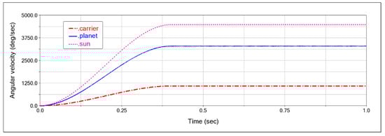 When the above procedures are finished, the model is run in ADAMS and the dynamic simulation is conducted; the rotating speeds of the ring carrier, sun gear, and planetary gear at all levels of the entire transmission system in the post-processing are worked out, and then the transfer of motion among the components of the entire system is studied. The rotating speeds of the ring carrier, sun gear, and planetary gear are shown in Figure 2.