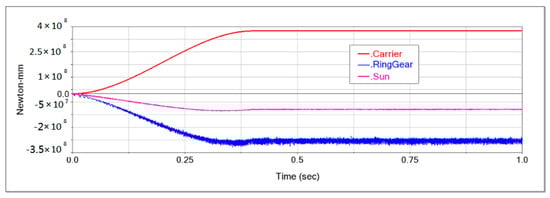It can be seen from Figure 3 that, when the gear train is running, from 0 to 0.4 s, the torque on each component increases slowly from 0 and reaches a relatively stable state at 0.4 s. The reason for such a torque change is incurred by the starting time of the entire system.