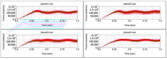It can be seen from Figure 3 that, when the gear train is running, from 0 to 0.4 s, the meshing force of each meshing pair increases slowly from 0 and reaches a relatively stable state at 0.4 s. There is a large meshing impact, which is incurred by the starting time of the entire system. During 0.4–1.0 s, each component’s speed and the whole gear train system reach a stable status. It can be seen from the images that the meshing force shows a periodic change and fluctuates around a certain stable value.