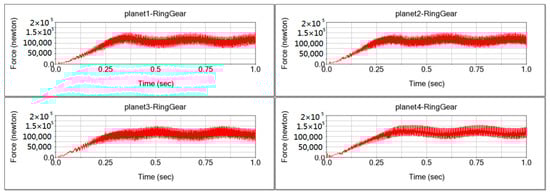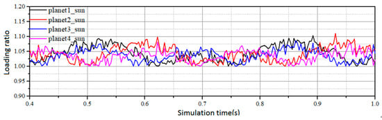 Through analysis, we find that such a change is caused by a periodic change in the meshing stiffness. The meshing force of each planet gear shows a sinusoidal fluctuation, and the frequency is the same as the rotation frequency of the carrier. Such a phenomenon is caused by the flexible deformation of the ring gear [,,]. Table 4 shows the average and maximum values of the simulation meshing force in the inner and outer meshing pair of planet gears.