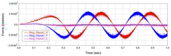 We extract the inner and outer meshing component forces of the gear transmission system, then analyze and obtain their values, as well as the reason for the vibration, as shown below in Figure 9 and Figure 10. From these figures in the x, y directions, the vibration mechanisms of the inner and outer meshing forces are the same. In general, these meshing forces show sinusoidal waves, and the wave frequency is the same as the rotation frequency of the carrier [,]. Meanwhile, high-frequency vibrations partially occur with time eclipsing. While in the z direction, the meshing force fluctuates around zero, because the double helical gear is symmetrical and the axial forces of the upper and lower gears cancel each other out.