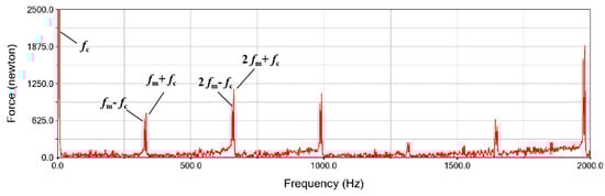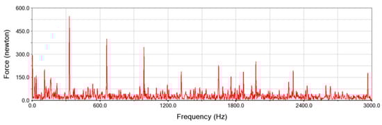 As shown in Figure 11 and Figure 12, we conduct Fourier transform between the meshing forces in the x and z directions of the sun gear and planet gear 1. Figure 12 shows the meshing force frequency domain curve in the x direction. It also indicates that the main peak value is the rotation frequency of the carrier, and it incurs the meshing force that sinusoidally fluctuates in the x direction, as shown in Figure 9, while the partial high-frequency vibration is mainly caused by the sum/difference value between the meshing frequency, its multiplier, and the rotation frequency of the carrier. In the vicinity of each peak, there is a longer sideband. This is because a sideband consists of many frequencies, including the mesh frequency and its multiplier, and the rotation frequency of each component and their multipliers. These frequencies have research value, such as a working state diagnosis, resonance point identification, and the dynamic vibration reduction design of a gear transmission system [,], and these can be used to diagnose the working states of the carrier, planet shaft, and gear. Figure 11 shows the meshing force frequency domain curve of the sun gear and planet gear 1 in the z direction. Figure 11 indicates that the main peak value is the meshing frequency, and the sub peak values are the multipliers of this meshing frequency. The other side-band frequencies are also incurred by the rotation frequency and their multipliers of each component of the planetary gear train system.