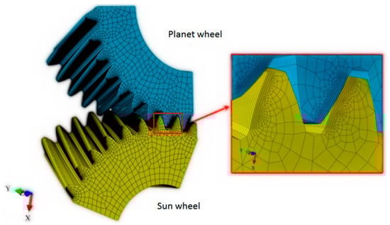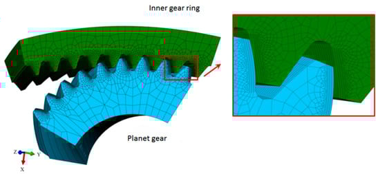 It can be seen from the analysis that the contact degree of the inner meshing gear pair is 3.6891. At one time, three pairs of gears are in the meshing state, and at one time, four pairs of teeth are in the meshing state. Therefore, in the analysis of a specific pair of teeth, from engagement to exiting the engagement process, at least seven pairs of teeth are required. In this model, nine pairs of teeth are used to study the change in the contact torque during the engagement of the fourth pair of teeth. The global gear model is shown in Figure 13. A mesh refinement was carried out in the contact area. The mesh far away from the contact area was rough, and the cell type was C3D8R. The mesh size of the contact area is about 0.3* ×0.1 × 1.8 mm, the number of tooth ring units is 231,485, and the number of planetary wheel units is 223,579.