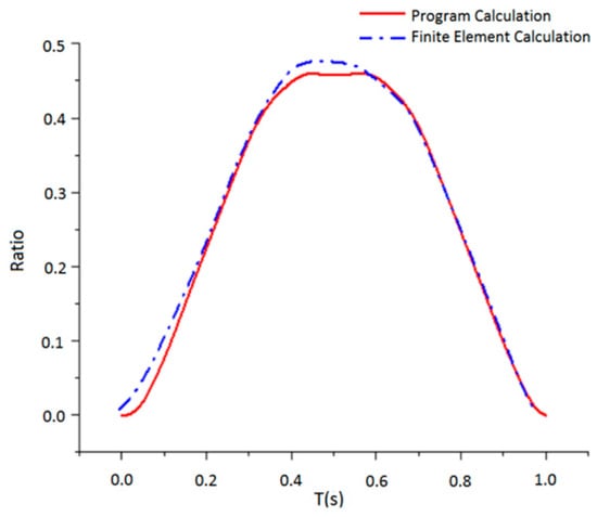 From 0.4 s to 1.0 s, the rotating speed of the planetary gear fluctuates periodically up and down near a certain stable value. The reason for this periodic change is caused by a periodic change in the meshing stiffness. Table 2 shows the statistical comparison between the simulation’s average value and the calculated theoretical value of the rotating speed of the gear train components at all levels [].