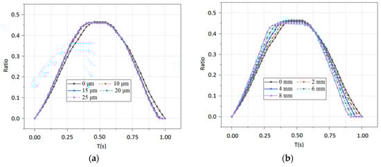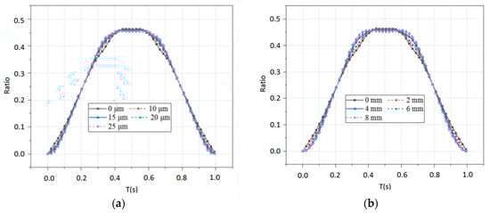 This paper explores the influence of the tip relief amount and tip relief length on the load sharing of the outer meshing. Figure 17a shows the tip relief amount and Figure 17b shows the relief length. Figure 17a,b indicate that, with an increase in the tip relief amount, the load variation becomes smoother. At the early and late stages, the load becomes smaller. The reason for is that, after tip relief, many gear teeth are no longer engaged in the meshing during this time. In the early–mid stage and mid–late stage of the meshing of one gear tooth pair, the other tooth pairs are either in the early meshing stage or the late meshing stage. This also results in an increase in the load in the early–mid and mid–late stages, and load decreasing in the mid stage. A single tooth (helical) on one side of the outer meshing on the double helical planetary gear can bear a 29,641 N load at maximum.