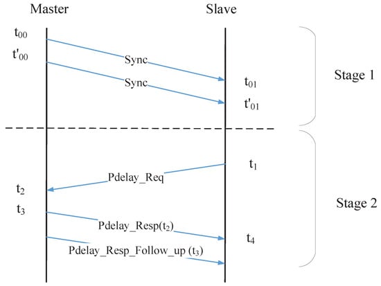 where and are the time of receiving sync messages at two interval time at the slave port, while and are the time of sending sync messages at two interval time at the master port. The other stage is that the slave port sends a delay request and the master port responds the delay request with two signaling messages to transmit the receiving time of delay request message and the sending time of the response of delay request, respectively, as shown in Figure 1. In this stage, the slave port can calculate the shift delay of reference time based on