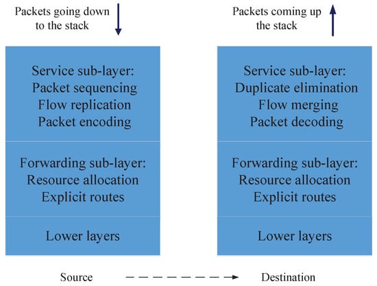 We firstly discuss related specifications on the data plane of Layer 3. The architecture of related data plane functions can be decomposed into two sub-layers, a service sub-layer and a forwarding sub-layer as shown in Figure 2 [45]. The service sub-layer provides service protection, such as packet replication, elimination, and packet ordering. The frame replication and elimination for reliability (FRER) is realized by transmitting packets and their duplicates along different paths and routers, which is similar to that of 802.1CB, while 802.1CB [38] performs frame replication and elimination within a LAN. We note that frame duplication, routing, and elimination are non-trivial tasks that will likely require centralized management. Hence, such protocols can be combined with other standards, e.g., 802.1Qcc [36] and 802.1Qca [34], to ensure seamless redundancy and fast recovery in time-sensitive networks. For the ordering function, it uses the sequence number, which is added to each packet to order the packets. The sequence number can be encoded into existing standardized headers. With the aid of the sequence number, it can enable a range of the packet order by dropping out-of-order packets or reordering some out-of-order packets with a tolerable time delay.