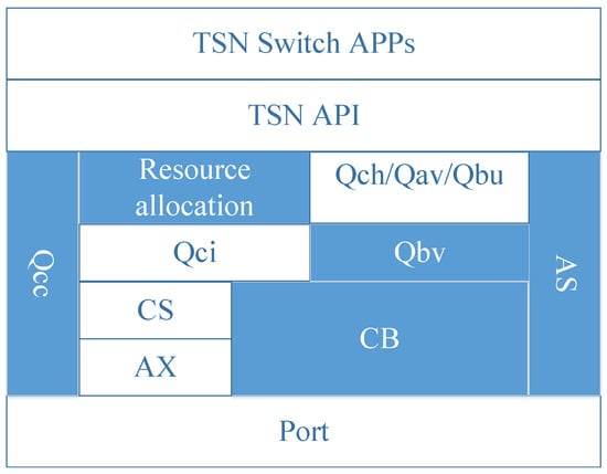 Safety-relevant devices, such as multiple kinds of sensors, need synchronization with each other to infuse them. In addition, synchronization is the preliminary step of many scheduling and management schemes. Thus, the 802.1AS [26] specification needs to be realized first. To provide deterministic transmission for critical traffic, such as the control comment, bandwidth reservation is needed. On the other hand, the traffic class is finite and fixed, compared with that of industry. Thus, a preferred bandwidth reservation method is pre-allocating the bandwidth for different application traffic instead of 802.1Qat [35] to reduce the signaling overhead and related information storage brought by the stream register of 802.1Qat. Correspondingly, a scheduling method is needed for bridges and end stations to queue and forward frames with different classes. 802.1Qav [30] is preferred for data transmission within a domain. For data transmission among multiple domains, 802.1Qbv [31] is an alternative method. In addition, 802.1CB can provide a baseline for giving redundant paths and supporting robustness. 802.1Qcc [36] can provide corresponding configuration for these protocols. Other specifications can be further realized for a more robust and deterministic network. The basic TSN protocol stack model of the switch of in-vehicle networks is shown in Figure 4, where blue blocks construct a minimum complete set of standards to be realized for a TSN-supported bridge of automotive networks. The end station can be seen as a bridge with a port.