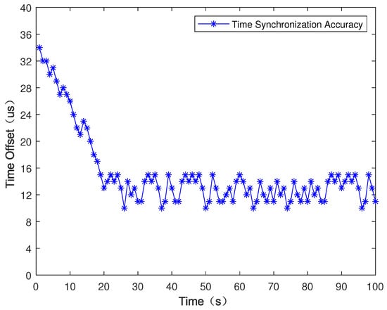As shown in Figure 6, the vertical coordinate time offset represents the time deviation between nodes measured at each time in s, and the horizontal coordinate time represents the time-synchronization interval, which is 1 s. After a short period of jitter at the beginning of the time synchronization, the time deviation between nodes tends to converge; the final value of this time-synchronous convergence converges to 14.5 s. The simulation experimental results show the effectiveness of the time synchronization, which shows that AS is feasible in the demo setup.