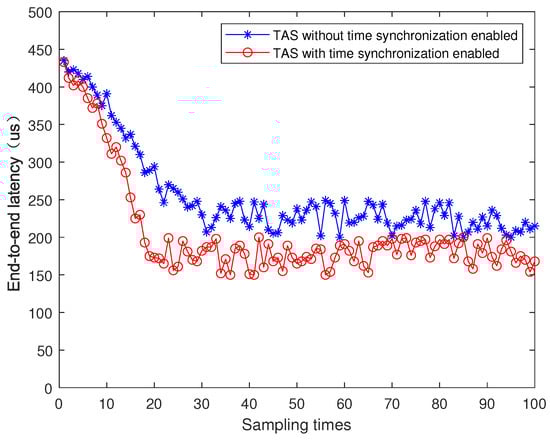 In Figure 7, the vertical axis end-to-end latency represents the total time it takes for a data packet to be sent from the sender to the receiver, measured in microseconds (s). The horizontal coordinate sampling times indicates the number of times the data are sampled at the same time interval. The impact of enabling the time-synchronization feature on the traffic-scheduling performance of the TAS algorithm is verified by comparing with and without enabling time synchronization, and the results show that the end-to-end delay of traffic is reduced by an average of 80 s when time synchronization is enabled. In addition, simulation experiments show that Qbv achieves end-to-end low latency performance under time synchronization, which also validates the effectiveness and feasibility of the demo setup.