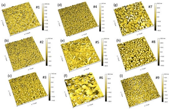 AFM image of the Cr2GeC and Cr2-xMnxGeC thin films on MgO(111). The images represent a frame size of 1.5 × 1.5 µm2. The zero position on the pseudo-color ruler is chosen in the middle of the displayed height of the unevenness of thin films. Subfigures from (a–i) are corresponds to samples from #1 to #9.