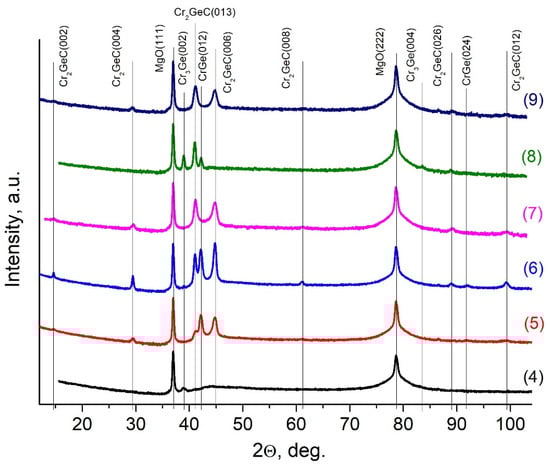 After preliminary AFM characterization for samples #4–#9, X-ray diffraction (XRD) analysis was performed. It was found that all samples predominantly consisted of the Cr2GeC MAX phase (ICDD 00-018-0384) and two chromium germanide phases, CrGe (ICDD 04-004-7750) and Cr3Ge (ICDD 01-070-2924) (Figure 2). For samples #5 to #7 and #9, the Cr2GeC phase was textured on the basal plane of the substrate, and reflections from the (013) texture were also observed, which formed on the lateral facets of MAX crystallites previously formed on the substrate. It was possible that a similar mechanism was responsible for the formation of CrGe crystallites, as indicated by the AFM data for samples #5 and #6. In addition to the flat islands with the diameters of 100 ÷ 300 nm, rods were observed, which were slightly inclined to the normal with lengths of 100 ÷ 150 nm and diameters of 40 ÷ 60 nm, growing at an angle of approximately 0° ± 60° to the [210]MgO direction. Notably, in sample #5, unlike #6, these thin rods protrude significantly above the film surface (Figure 1e). It can be assumed that these rods in samples #5 and #6 corresponded to chromium germanides CrGe and Cr3Ge.