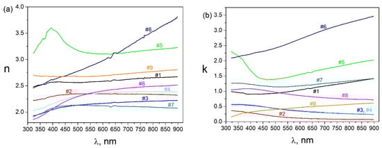 The spectra of the refractive index n and absorption coefficient k of the synthesized films are presented in Figure 3. Among the optical properties, sample #5 stood out, exhibiting a plasmon peak in the range of 200 ÷ 300 nm, which was likely a result of the effect of protruding CrGe rods observed in the AFM images on the optical properties of the film. Similar faint peaks, possibly attributed to the film morphology, were visible in the spectra of all samples, except for #6 and #9. The characteristic long-wavelength slope of the Drude peak in the k spectra indicated metallic conductivity of the films in samples #1, #5 ÷ #7, and #9. Sample #9 was of particular interest due to its lowest optical absorption k but relatively high refractive index n, which may be due to the larger grain size with the low grain boundary defect density []. Materials with such a high refractive index were relevant for the development of visible light localization devices, such as light-emitting diodes [], and structures with gradients n and k for solar energy applications []. Sample #6, with a thickness of 100 nm, showed the highest values of n and k, for which bulk optical properties and a weak contribution of surface morphology already predominated, which was due to the light entering the ellipsometer aperture, mainly reflected from flat epitaxial crystallites. The samples #2 ÷ #4, likely having low conductivity due to their small thickness and high film dispersion, exhibited the lowest k values.