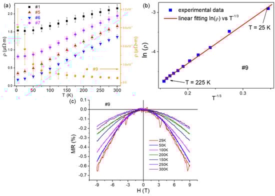 (a) Resistivity of Cr2GeC and (Cr,Mn)2GeC. (b) ln(ρ) vs T−1/3 dependence illustrating 2D hopping conductance mechanism for sample #9. (c) Magnetoresistance dependences for sample #9.