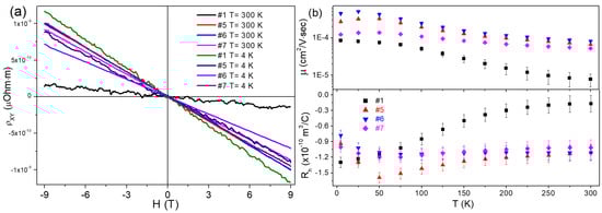 The Hall effect (Figure 5a) and magnetoresistance were measured for the conducting samples over a wide temperature range (4 K ÷ 300 K) and magnetic field up to 9 T. The Hall constant RH, mobility μ, and charge carrier concentration n were calculated (Figure 5b), using the standard expressions: