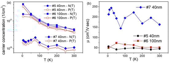The mobility for all Cr2GeC samples was in the range of a few cm2/V·s which was a typical value for metals. It should be noted that the temperature dependence of mobility exhibited a non-monotonic behavior, showing a maximum around 40 ÷ 50 K. Similar behavior was observed for bulk samples and was likely associated with an electron–electron scattering component []. The calculated carrier concentration N was very high; for example, for sample #6, the concentration at 4.2 K was close to the electron concentration for copper, which was ~8.4 × 1028 1/m3.