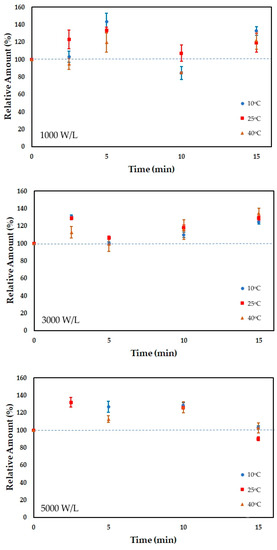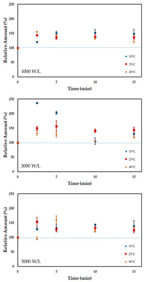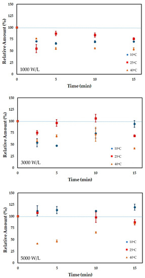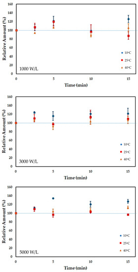 The relative amount of vitamin B1 after ultrasound processing is presented in Figure 1. Sonication increased vitamin B1 content in the first 10 min of processing. The increase may be related to converting the phosphorylated form to the free form of vitamin B1, which the analytical method detects [42]. After 10 min of processing at 5000 W/L, the vitamin content decreased due to a probable degradation induced by the hydroxyl radicals produced during sonication. Lower power densities (1000 and 3000 W/L) did not degrade the vitamin B1 in FOS-enriched acerola juice, which increased between 19 and 34% relative to the untreated juice. FOS showed a protective effect on vitamin B1 since an increase in its content was observed herein, whereas in a previous work without FOS addition vitamin B1 showed a significant loss during sonication [29]. The processing temperature did not significantly affect (p < 0.05) the retention of vitamin B1.
